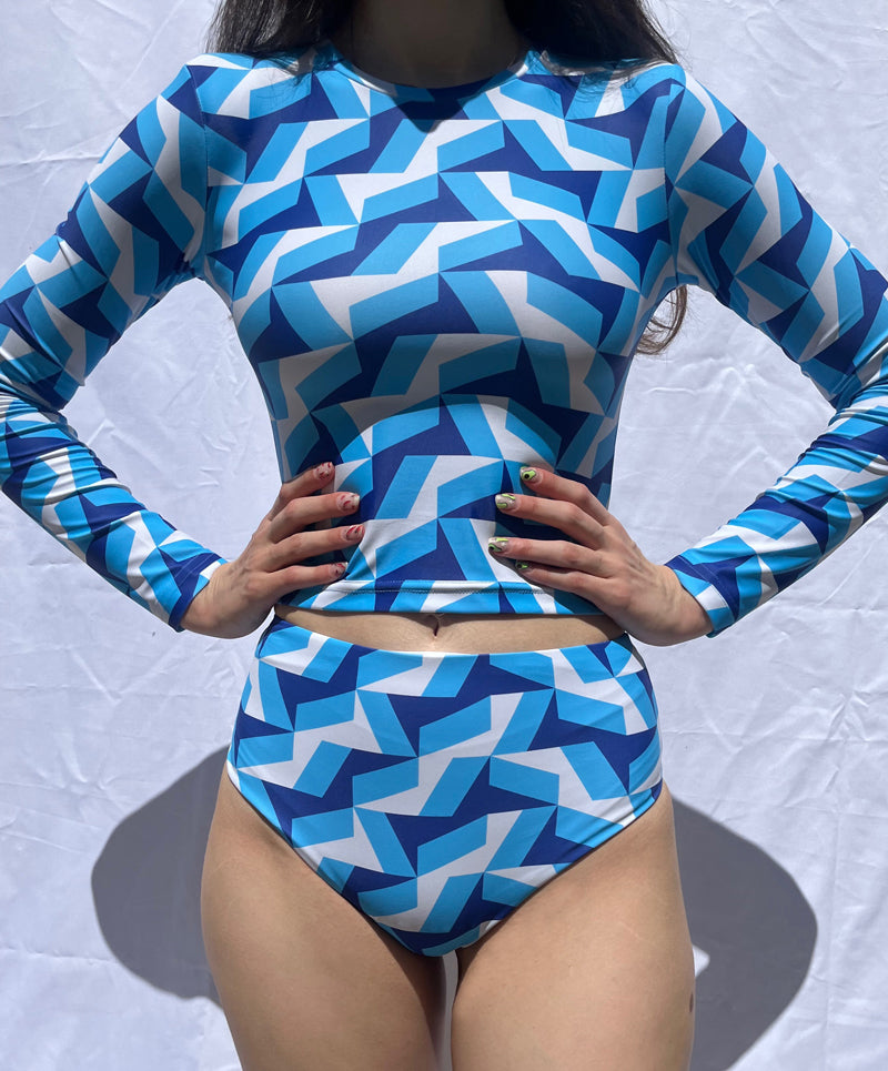 Long sleeve top ideal for water sports and protection by the sun for the top and high waisted bottom swimsuit.