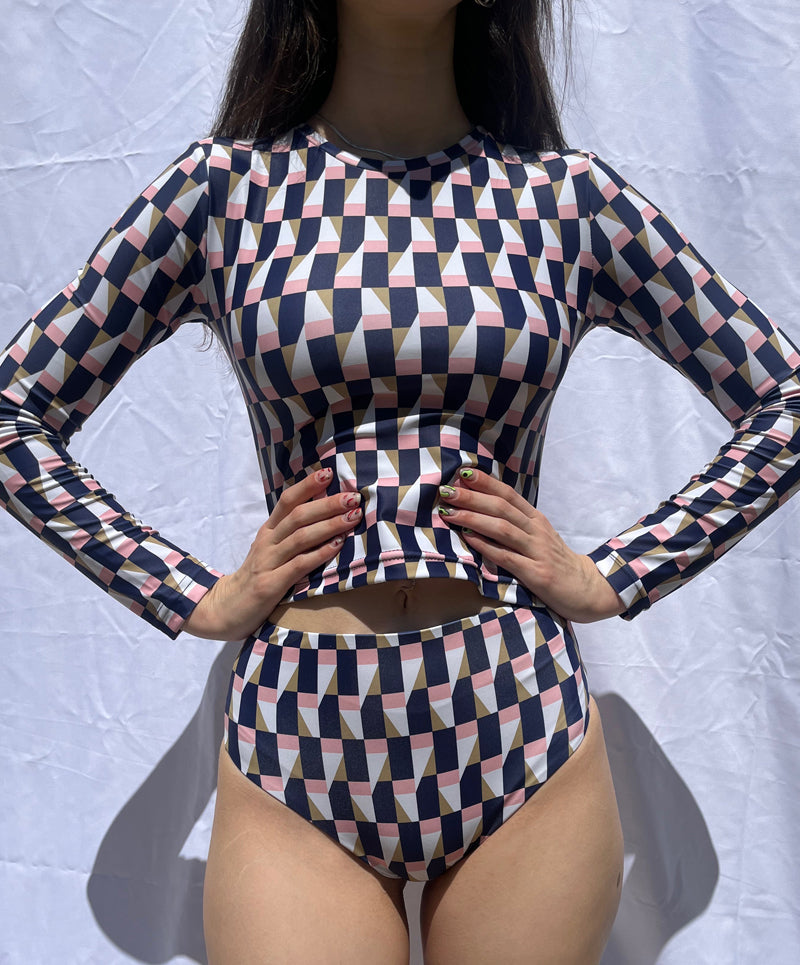 Long sleeve top ideal for water sports and protection by the sun for the top and high waisted bottom swimsuit.